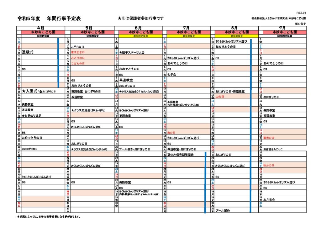 「令和5年度 本妙寺こども園 年間行事予定表」を掲載しました。